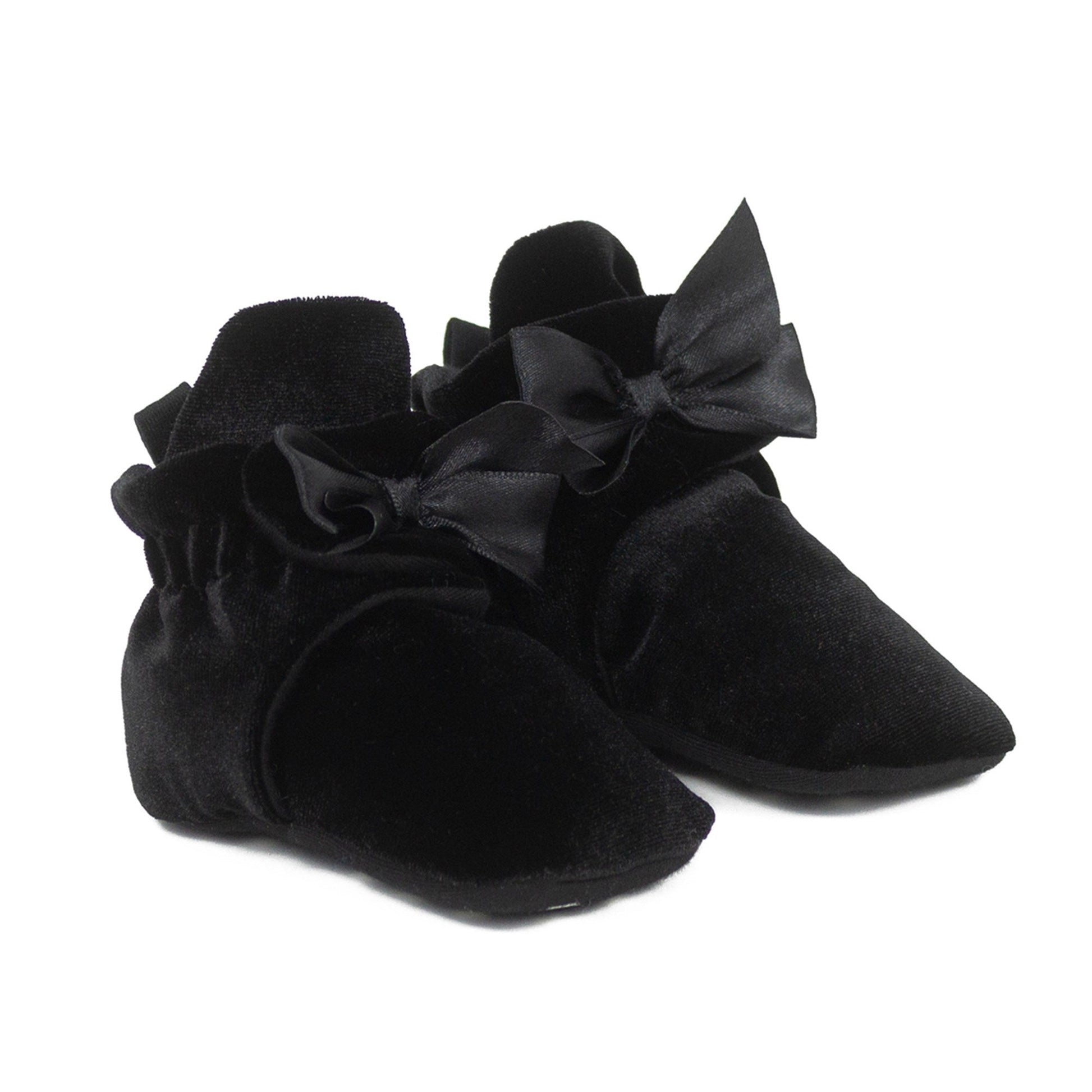 - Black velvet bootie with 3D satin bow with soft insert in foot bed, jersey outsole