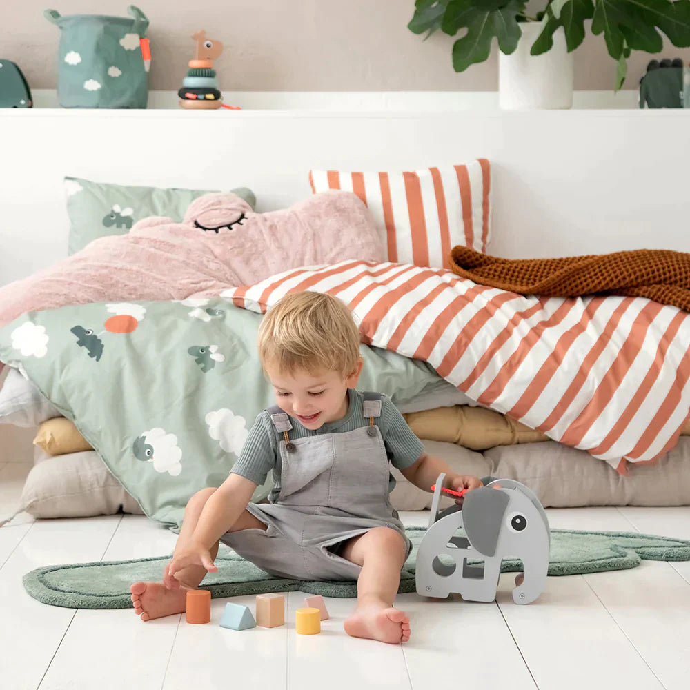 The elephant shape sorter in grey tones with colourful bricks is made from responsibly sourced wood and is painted with water-based paints that are free from harmful subtances - making it safe for your child to use.