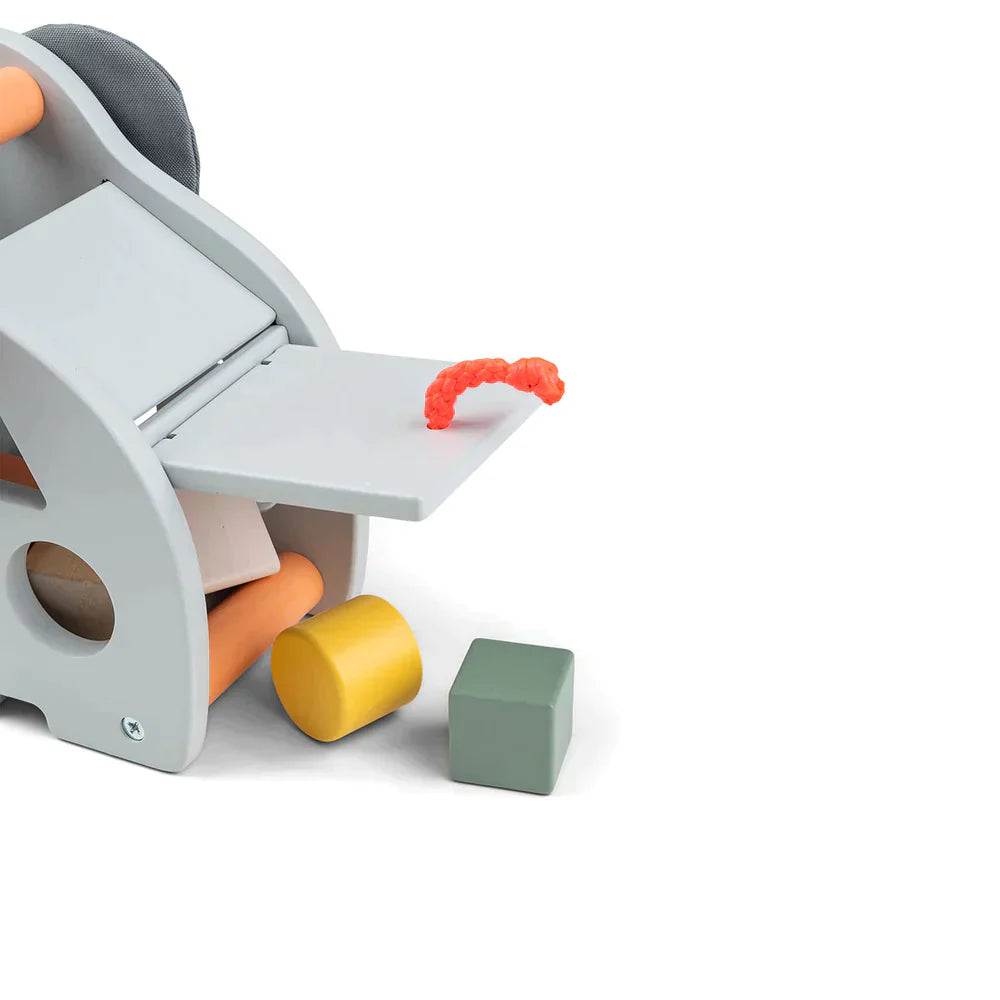 The grey Elphee wooden sorting box helps your child train fine motor skills and learn about shapes when it practices putting the geometric bricks into the box. The handle makes the elephant sorter easy for little ones to bring along.