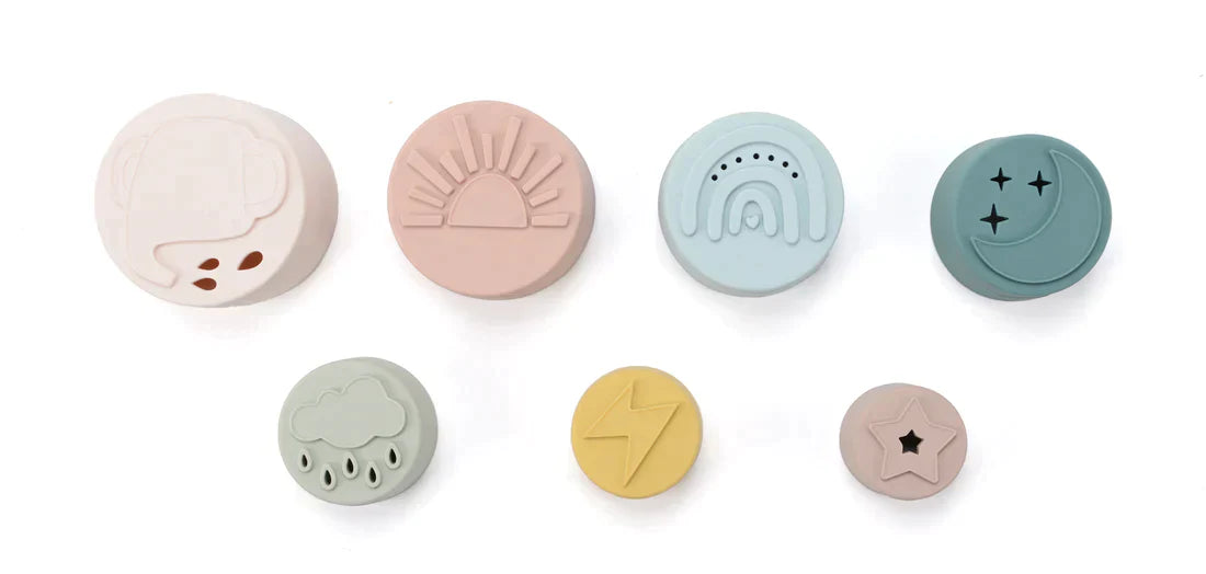 Our silicone nesting and stacking cups are the must-have sensory and educational toys for all ages. Adorned with a fun design on each cup, this set of seven cups is made of 100% food-grade silicone that is soft and gentle, essential from playtime to bath time! For ten months and up.