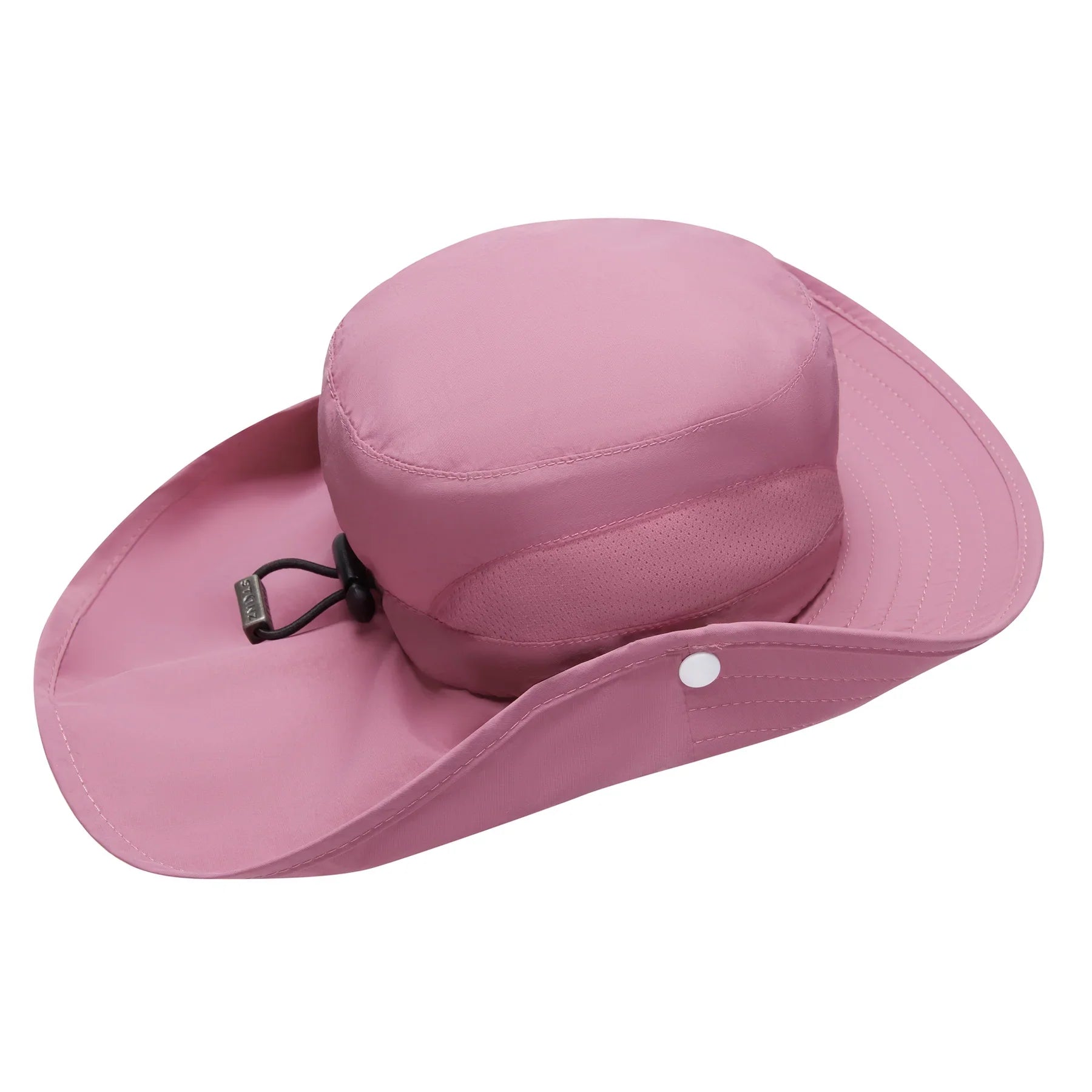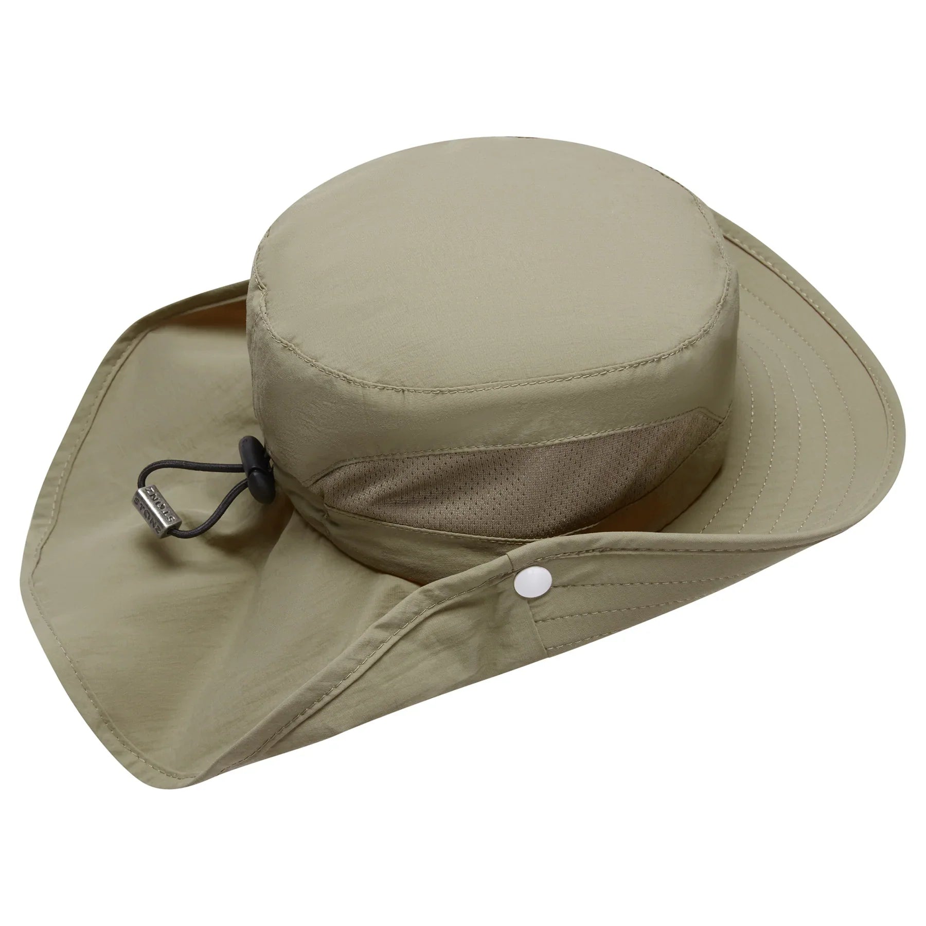 Tight-knit material with UPF 50+ sun protection, with adjustable chin strap and full neck coverage across the back.