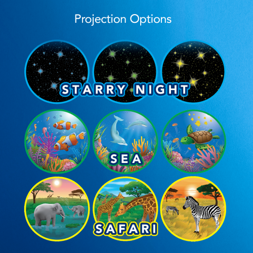 · Clear projection of images that offer consumers 3 different dreams inspired themes – sea, safari, and starry night to choose from – with 3 scenes per theme –