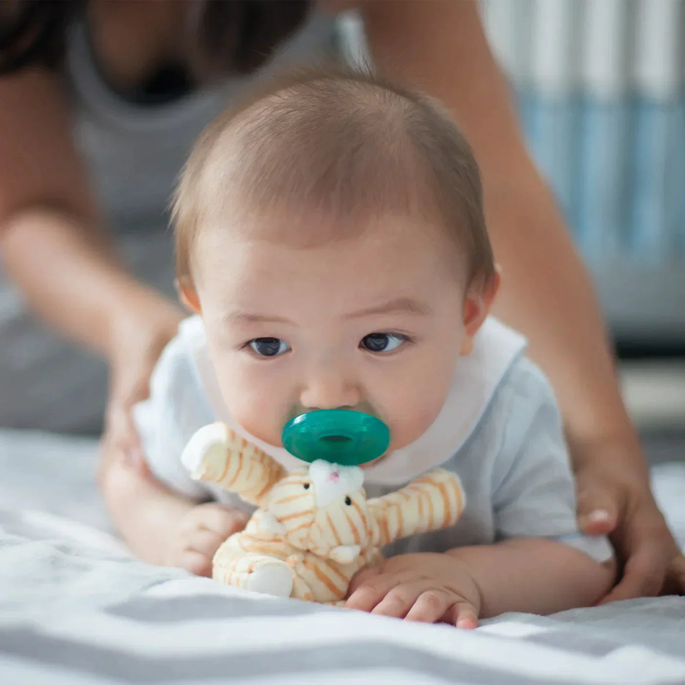 The carefully calculated weight and size of each stuffed friend keeps the pacifier positioned close to even the fussiest baby’s mouth.