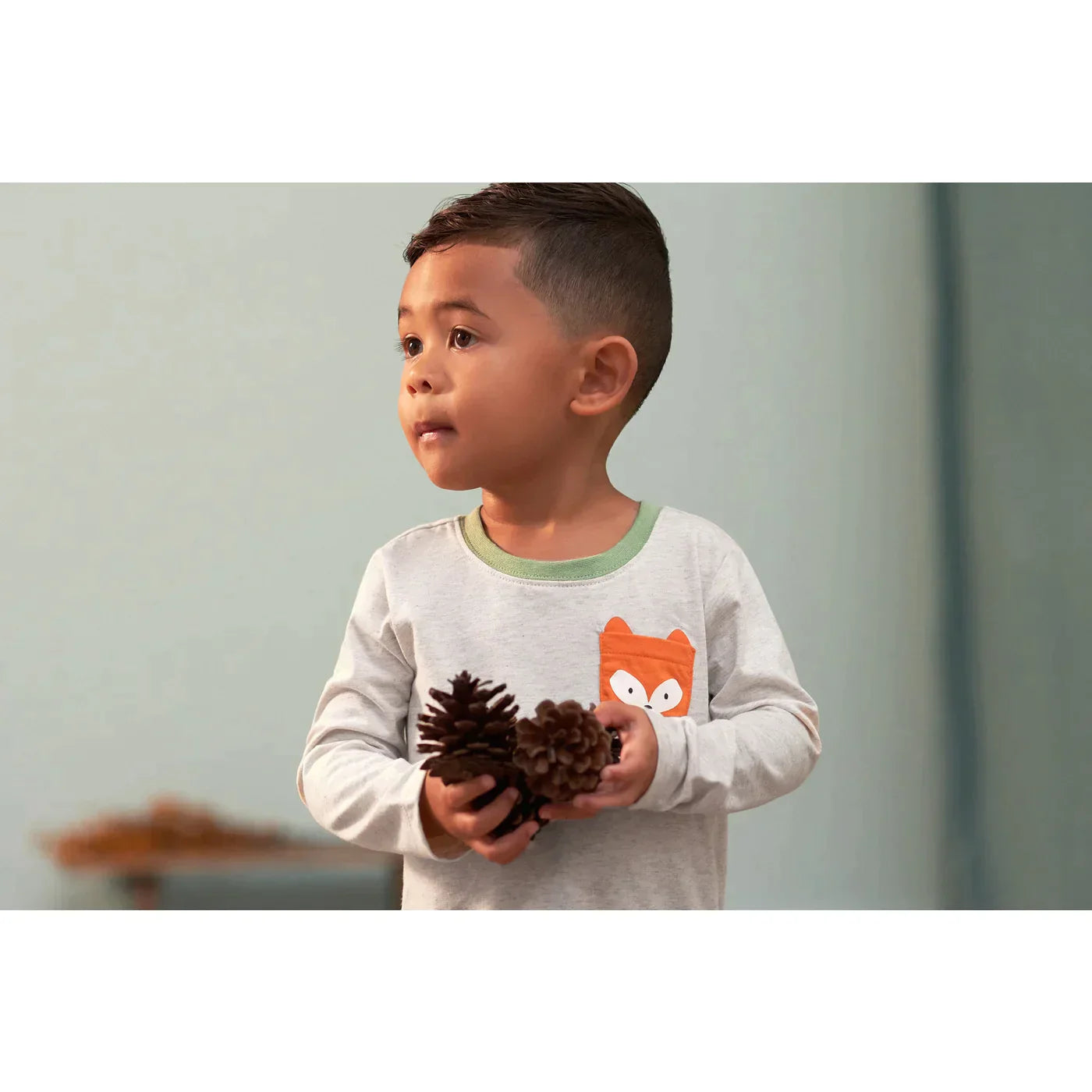 This handsome 2-piece baby and toddler boy outfit by Gerber® Childrenswear is soft and warm, made with gentle cotton fabrics. We use STANDARD 100 by OEKO-TEX® certification on products tested in an independent laboratory against a list of more than 400 harmful substances, including PFAS. This oatmeal and green 2-piece set includes one long sleeve tee and one pair of boys’ joggers with screen print and puff print fox and bear art.