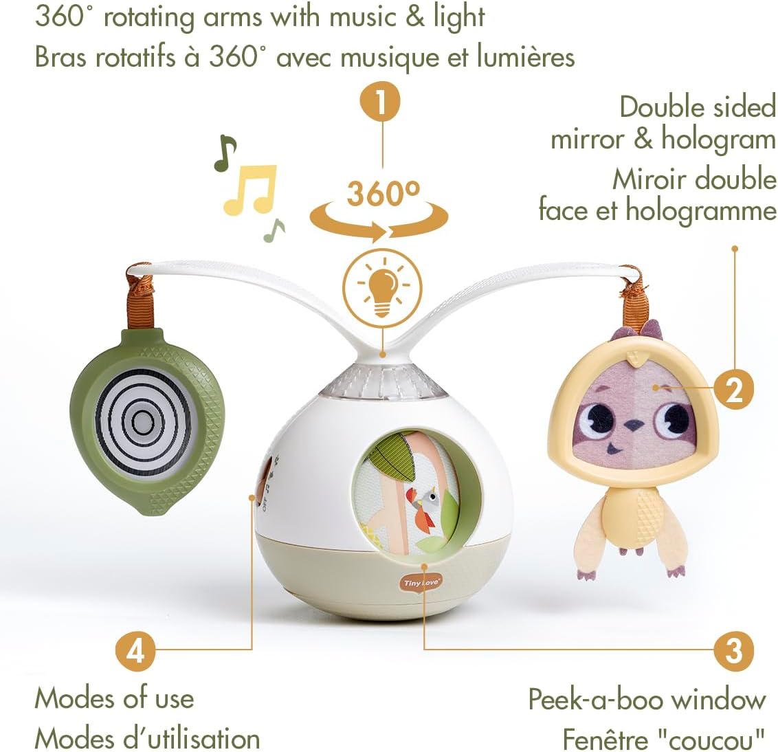 Place mobile at the appropriate distance from baby (around 25cm away) and let them enjoy the engaging sound and movement while in tummy time, helping them gradually stay in the position a little longer. When you leave the house, take the mobile along so baby can enjoy the comfort of a familiar toy.