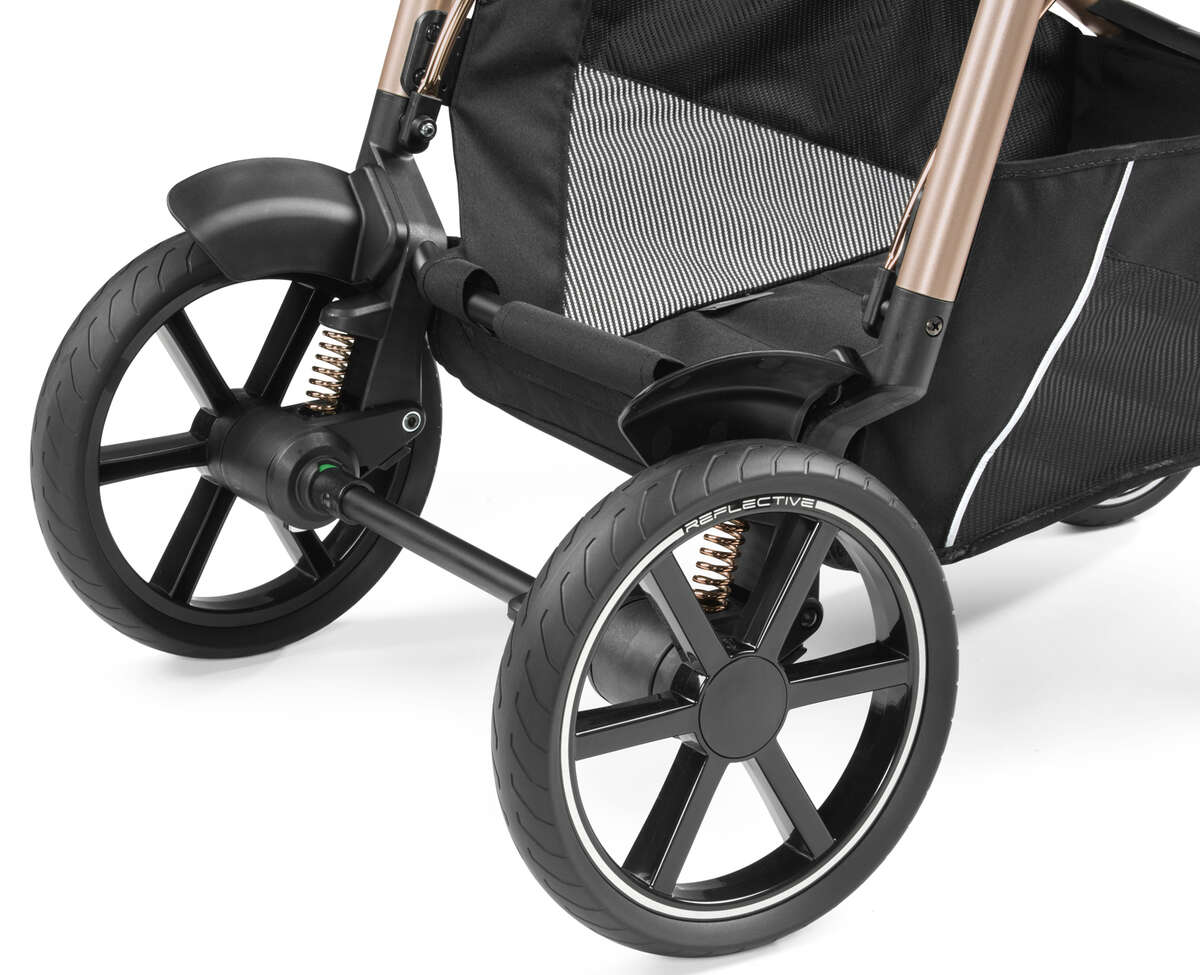 The soft-ride wheels, rear shock absorbers with visible springs, and ball bearings ensure agile steering on all terrain. You can adjust the front wheels, from locked to swiveling and vice versa. Wheels with high-visibility finishes are ideal even on the evening walks. User-friendly brake.