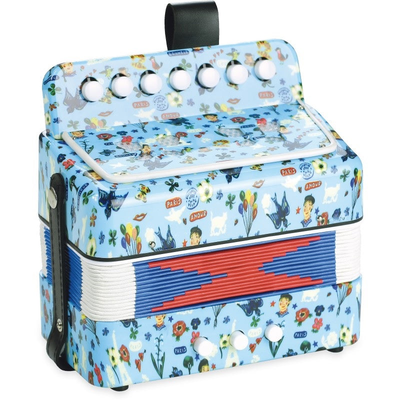 Accordion by Vilac featuring the artwork of Nathalie Lete features 10 keys and 14 tones