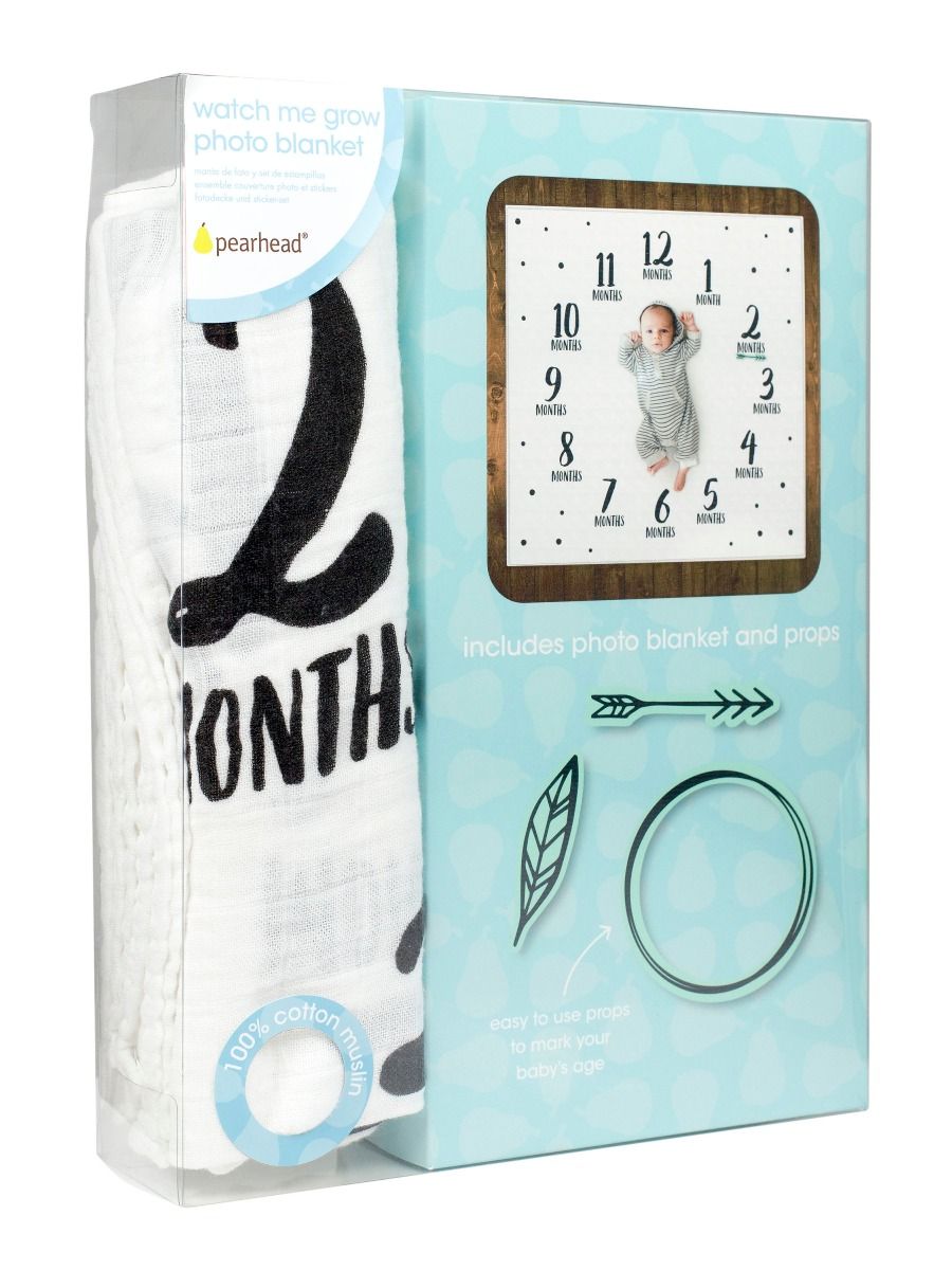 Watch baby grow with Pearhead’s watch me grow photo blanket. This adorable photo blanket set includes a 100% cotton muslin blanket and 3 photosharing props to track baby’s growth during their first year.