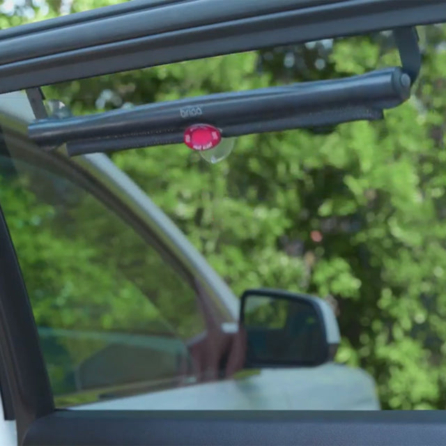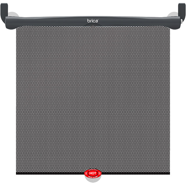 An easy-to-use, retractable car shade that blocks the sun and features a White Hot® patented heat alert system that turns white when the car is too hot.